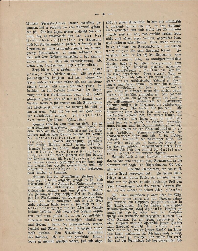 Heft einer 15-Seitigen Rede mit dem Titel „Deutschland über alles!“ von Gustav Stresemann, die er am 19.Dezember 1918 in einer Versammlung der Deutschen Volkspartei in Osnabrück gehalten hat.