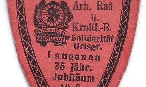 Pappabzeichen des Arbeiter Rad und Kraftfahr – Bund (ARB) aus Langenau (Baden-Württemberg /Alb-Donau Kreis) zum 25 jährigem Jubiläum der Ortsgruppe am 19.07.1931.