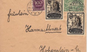 Briefumschlag an „Fräulein Hanna Ahnert“ in „Hohenstein -Er.“. Vermutlich ist Hohenstein-Ernstthal in Sachsen (Landkreis Zwickau) gemeint. Der Brief wurde am 22.Juli 1923 abgestempelt und trägt – neben zwei Marken der Deutschen Reichspost zwei Spendenmarken der SPD / Arbeiterwohlfahrt zu 15 Mark. In Rostock kostete etwa zum gleichen Zeitraum eine Tasse Kaffee 5.500 Mark. Die Spendenmarken dürften daher schon weit vor dem Tag der Abstempelung ausgegeben worden sein. Auf der Marke […]