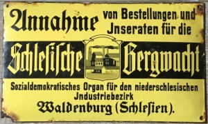 Emailleschild der sozialdemokratischen Zeitung „Schlesische Bergwacht“ (Waldenburg). Die Zeitung wurde ab 1911 ausgegeben und 1933 verboten.