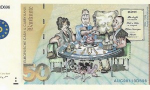 Agitationsschein „50 Euro“ der „Europäischen Cash & Carry Bank“. „Mainhattan – 1.Juli 1996“. Dieser Schein wurde extren aufwendig produziert. Er erinnert nicht nur in den Grundzügen dem bis dahin gültigen 50 DM Schein, er besitzt sogar einen aufgedruckten Sicherheitsfaden und ein Wasserzeichen. Abgebildet wurden Margaret Thather (britische Premierministerin 1979 -1990), Helmut Kohl (deutscher Bundeskanzler (1982-1998) und Jacques Chirac (französischer Premierminister 1974-1976 bzw. 1986.1988).