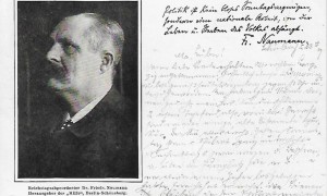 Postkarte mit Bild und Zitat von Dr. Friedrich Naumann, Briefmarke abgestempelt im Jahr 1909. Joseph Friedrich Naumann (* 25. März 1860 in Störmthal/ nähe Leipzi; † 24. August 1919 in Travemünde) war ein deutscher evangelischer Theologe und liberaler Politiker. Er war Mitbehründer des Deutschen Werkbundes und der Deutschen Demokratischen Partei (DDP). Die FDP-Nahe Friedrich-Naumann-Stiftung für die Freiheit wurde nach ihm benannt.