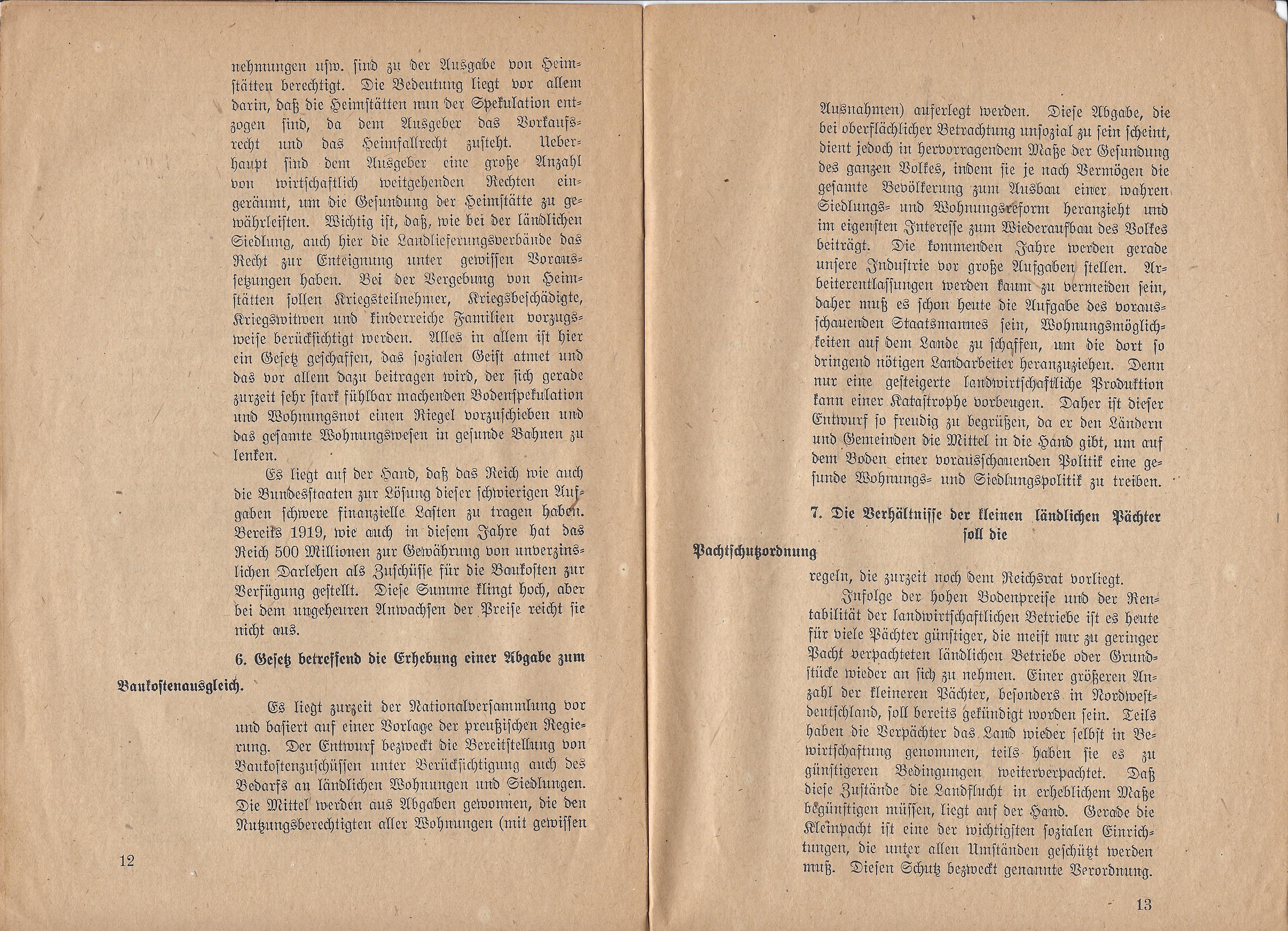 15 Seiten starke Broschüre „Das Siedlungswesen im neuen Staate – Eine Vortragsdisposition“. datiert im Mai 1920. Die Broschüre trägt einen Stempel „Bezirksverband Berlin – S.P.D. – Abteilung 88“. Es dürfte sich hierbei um eine interne Information handeln, die speziell für Redner (vermutlich der SPD) zusammengestellt wurde.
