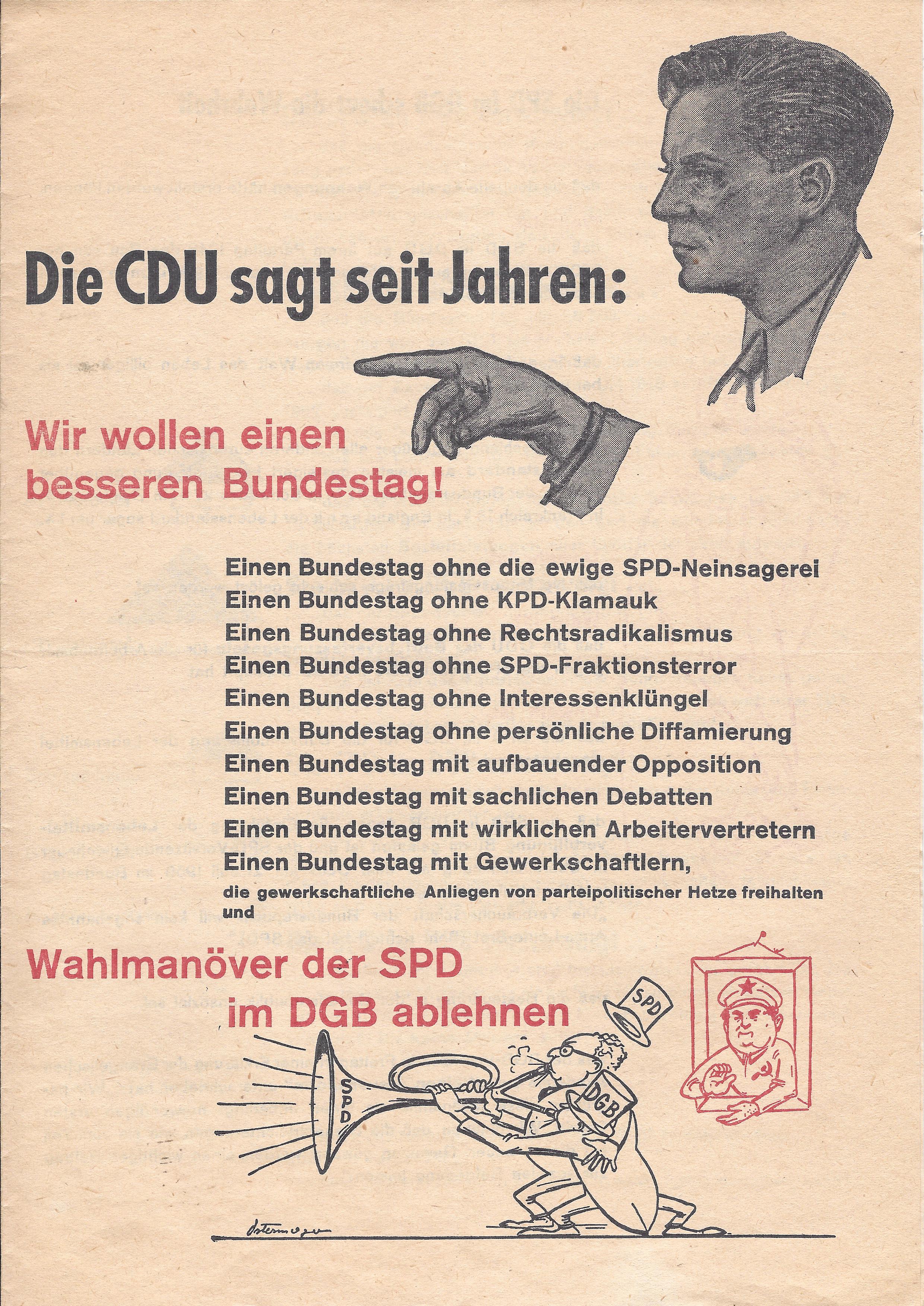4-Seitige A4 Broschüre „Die CDU sagt seit Jahren:“ der CDU zur Bundestagswahl 1953. In dieser Broschüre wendet sich die CDU vor allem gegen die SPD bzw. den Deutschen Gewerkschafts Bund (DGB).