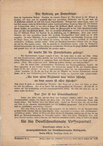 Flugblatt „Die Spuren schrecken!“ der Deutschnationalen Volkspartei (DNVP). Das Flugblatt trägt die Nummer 3 und wurde für die Wahl zur Nationalversammlung 1919 ausgegeben.