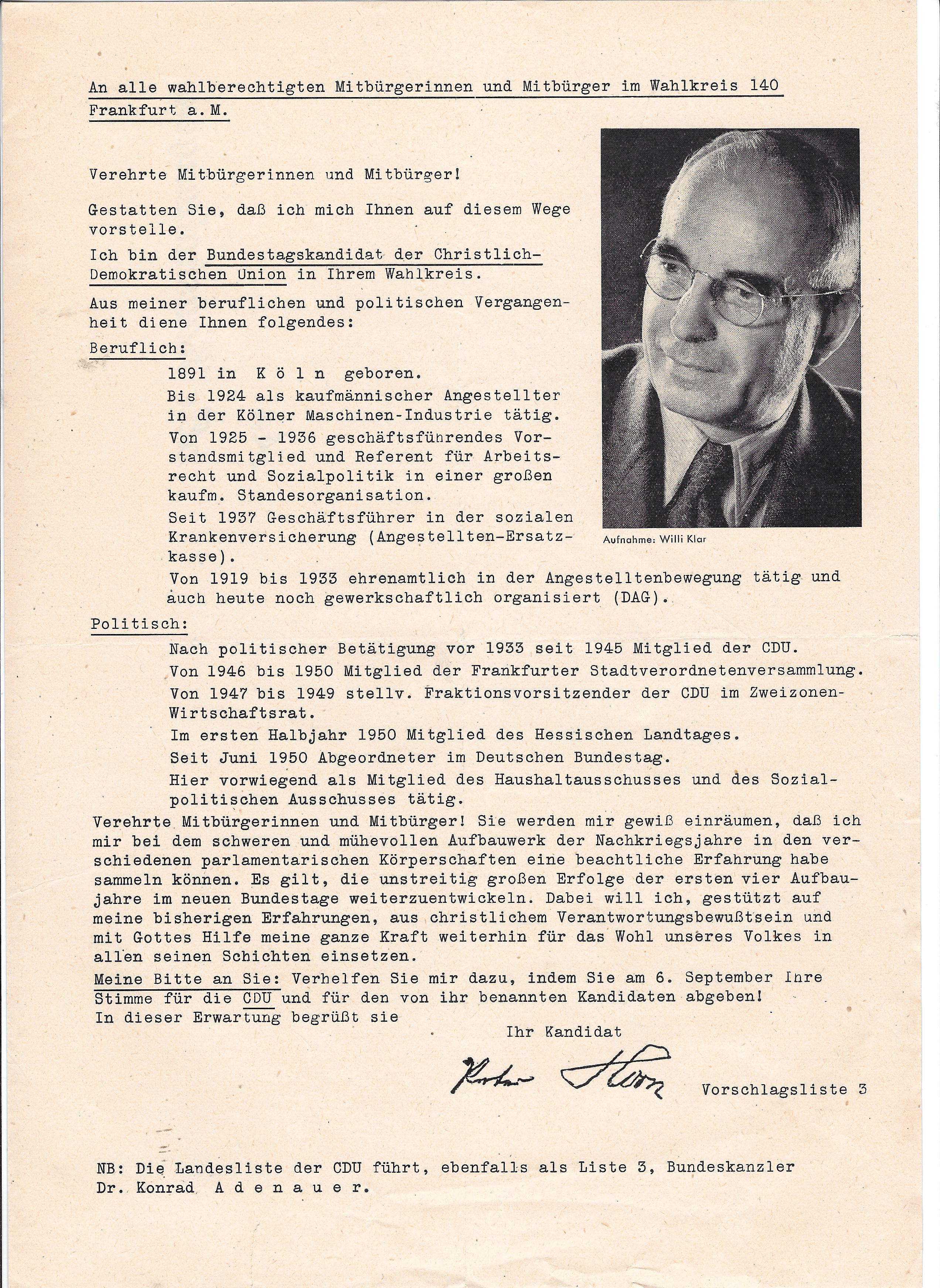 Flugblatt des CDU Bundestagsabgeordneten Peter Horn (CDU) zur Bundestagswahl 1953 für seinen Wahlkreis 140 (Frankfurt am Main).