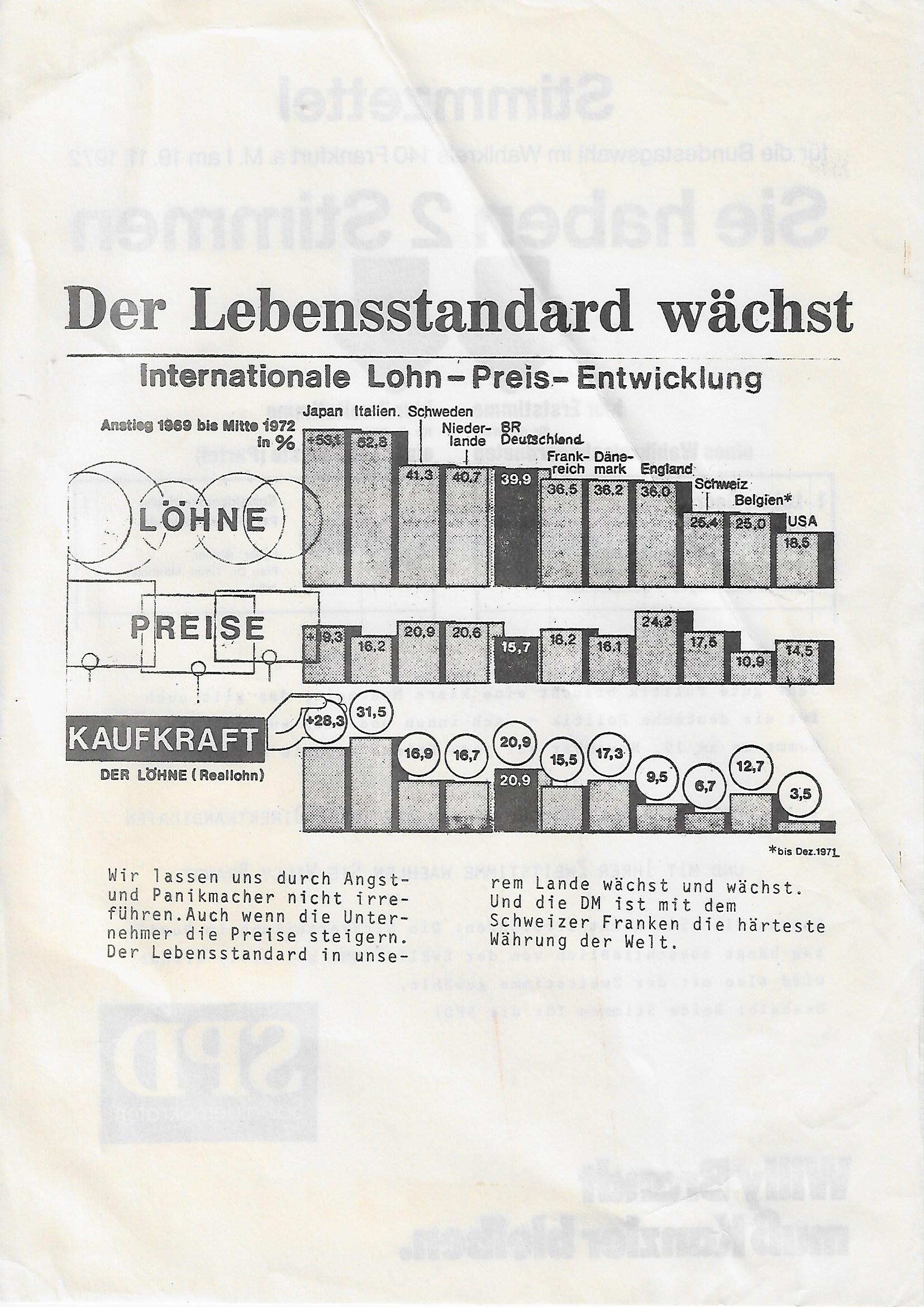 Flugblatt „Sie haben 2 Stimmen“ der SPD zur Bundestagswahl am 19. November 1972. Dieses Flugblatt wurde für den damaligen Wahlkreis 140 Frankfurt am Main ausgegeben und ruft nicht nur zur Wahl des ehemaligen Bundeskanzlers Willy brandt auf, sondern informiert auch über die Unterschiede Erst- und Zweitstimme. Als Direktkandidat trat Georg Leber (7.10.1920-21.8.2012) an. Dieser war von 1966-1972 Bundesverkehrsminister und zusätzlich von 1969 bis 1972 Bundespostminister. Nach der Wahl 1972 war er bis 1978 Bundesverteidigungsminister. Das Amt eines Bundestagsvizepräsidenten hatte er von 1979 bis 1983 inne.