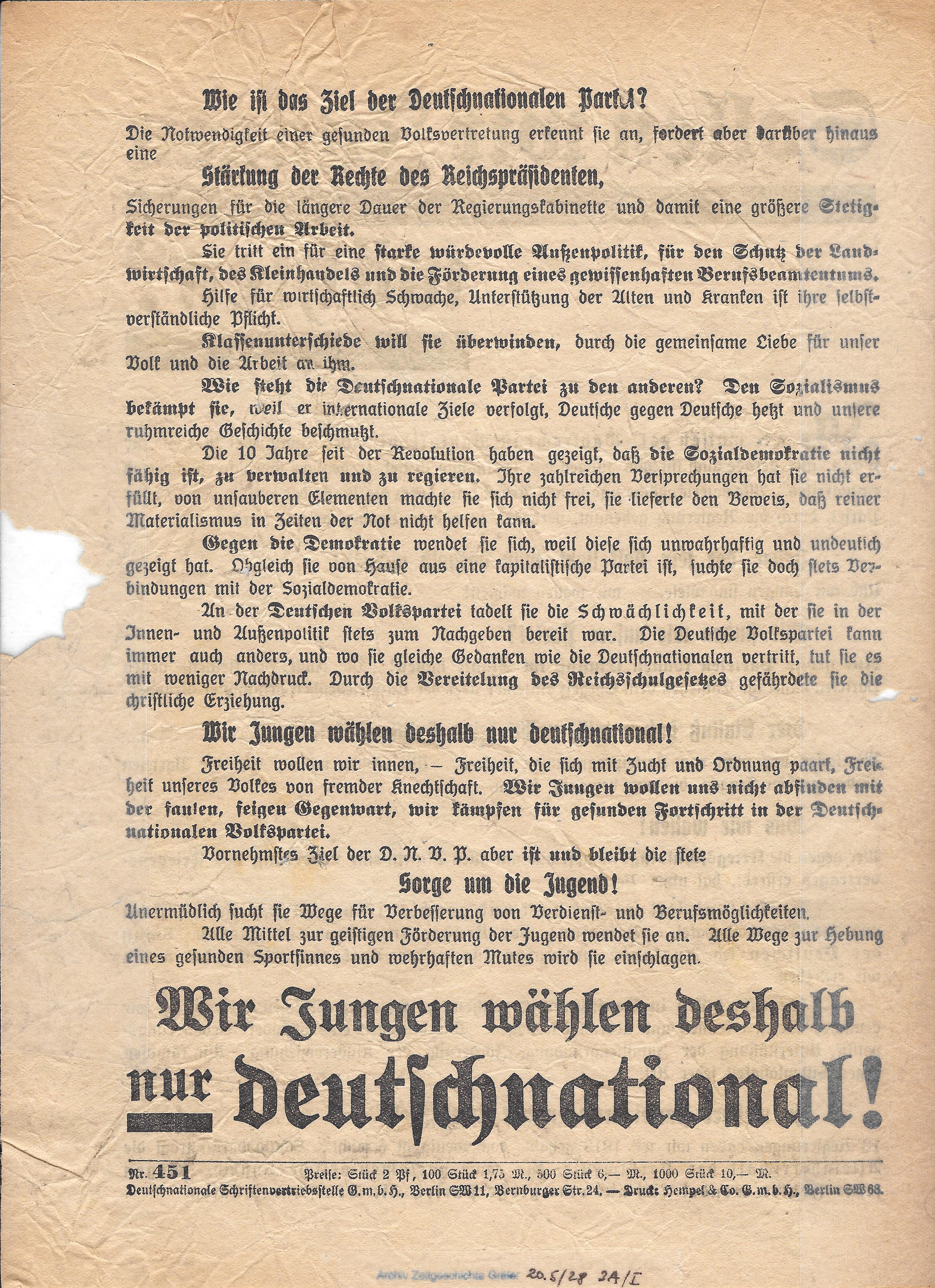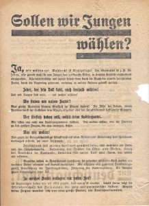 Din A4-Flugblatt „Sollen wir Jungen wählen?“ der Deutschnationalen Volkspartei zur Reichstagswahl am 20.Mai 1928.