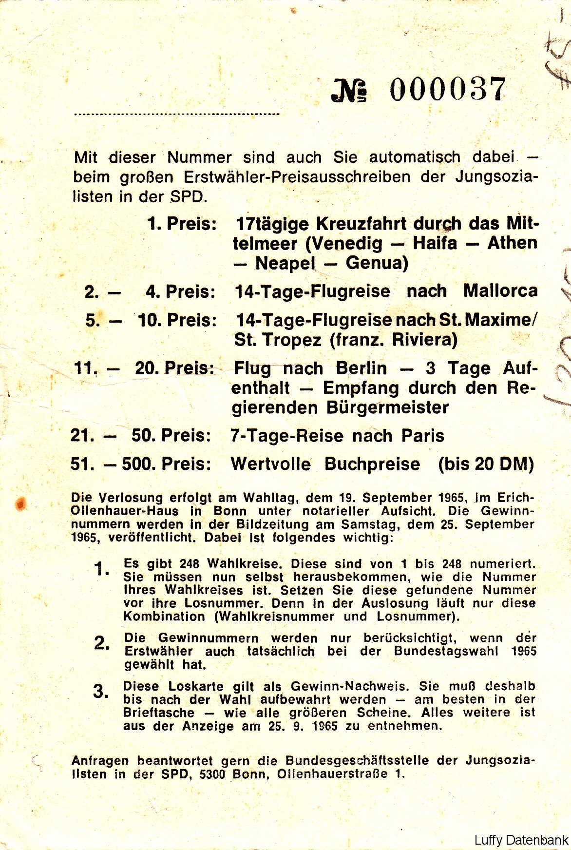 Wahlwerbung (Los) zur Bundestagswahl 1965 von Harri Bading (1901-1981). Harri Bading war von 1957-1969 Bundestagsabgeordneter und von 1964-1970 Mitglied des Europaparlamentes.