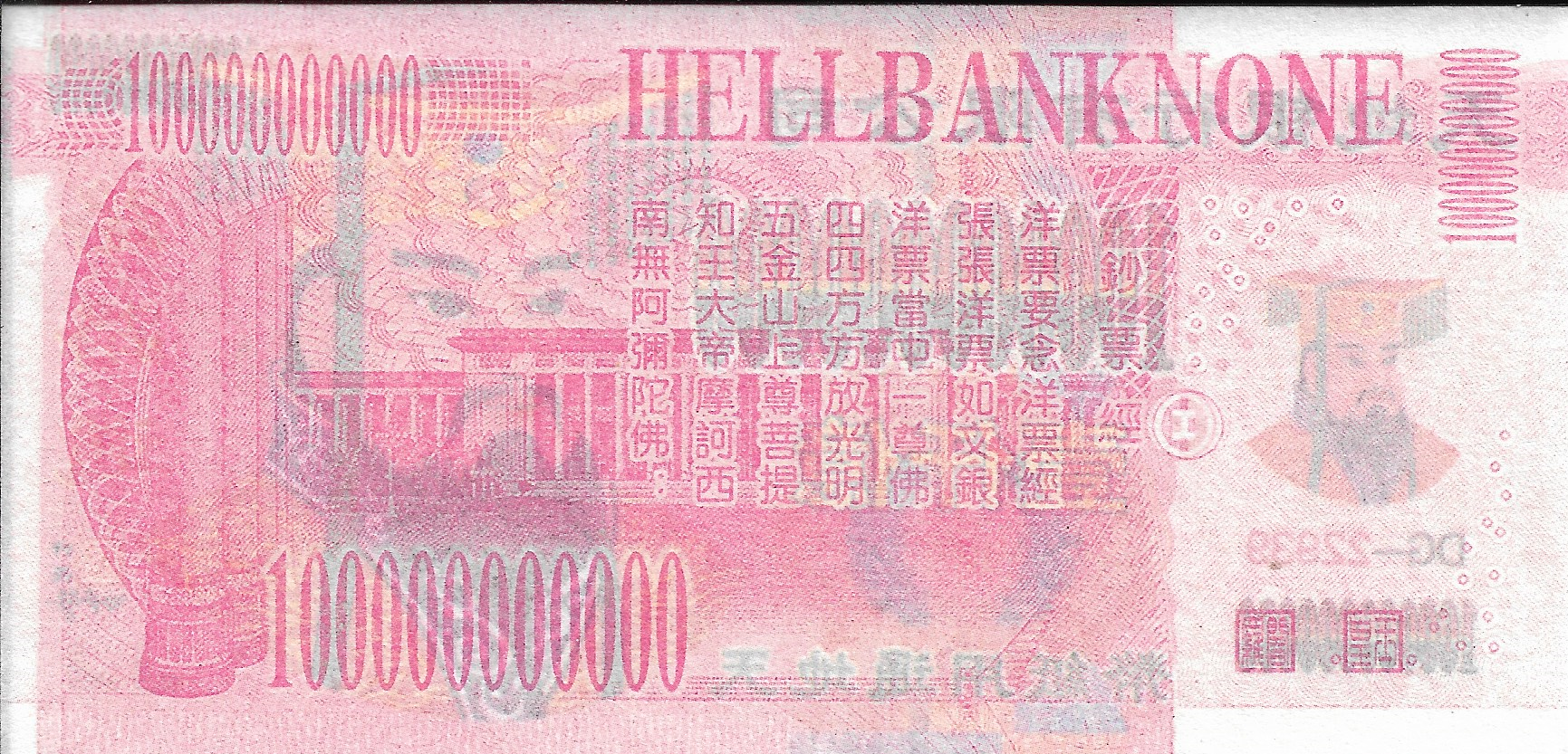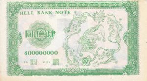 Höllengeld ist eine Form des so genannten „Geistergeldes“. Es handelt sich dabei natürlich um keine offiziell anerkannte Währung oder gar ein gesetzliches Zahlungsmittel. Einziger Verwendungszweck dieser Scheine ist es, verbrannt zu werden, um als „Geschenk“ an einen Verstorbenen ins Jenseits zu gehen. Der Begriff „Hölle“ ist in der chinesischen Mythologie weniger negativ besetzt als in den westlichen Kulturkreisen. Trotzdem kann eine „Verwestlichung“ festgestellt werden, da neuere Scheine als „Heaven Bank Note“ bezeichnet werden.