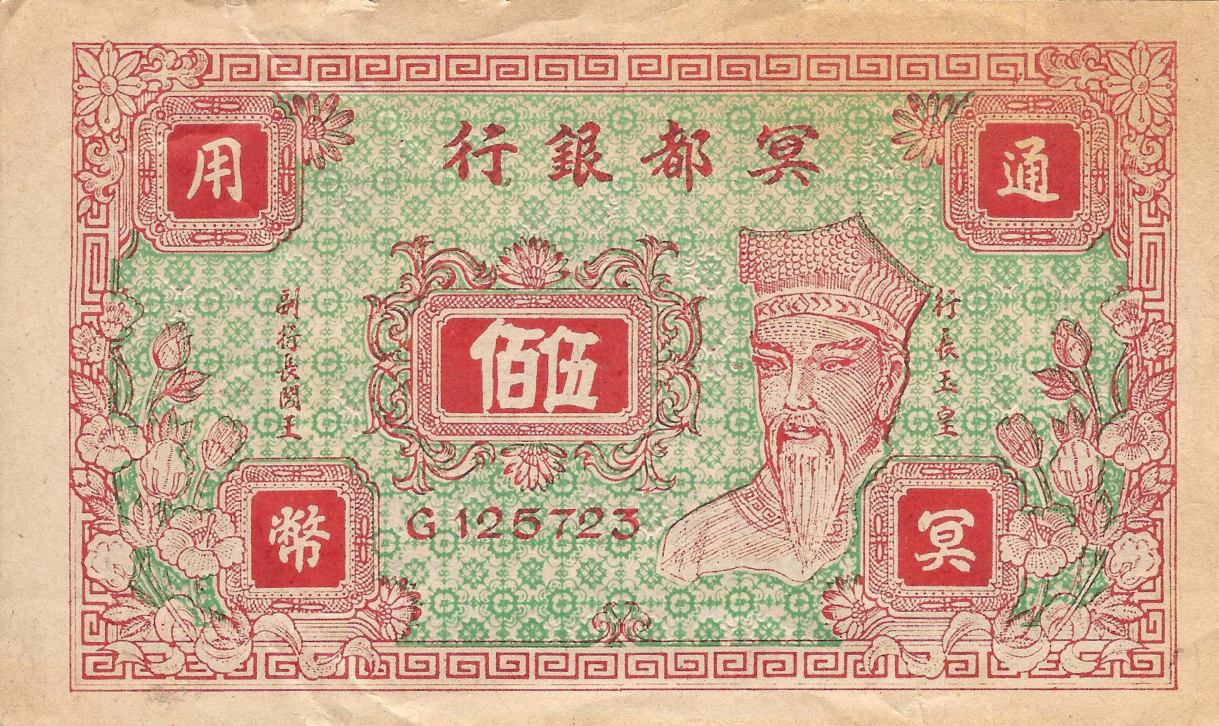 Verbreitet ist diese Sitte im chinesisch/asiatischen Kulturkreis. Höllengeld ist mindestens seit dem Ende des 19. Jahrhunderts in Gebrauch, und löste das Verbrennen von echten Banknoten ab. Anfang des 20. Jahrhunderts begann man, solche Scheine in verschiedenen Größen und Farben zu drucken. Dabei näherten sie sich optisch immer mehr echten Umlaufscheinen an. Heute sind viele hunderte Varianten aus unterschiedlichsten Regionen und mit unterschiedlichsten Werten zu finden.