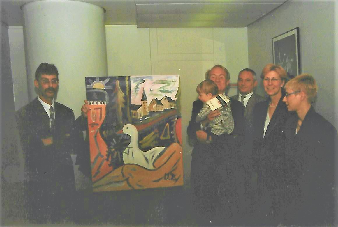 Übergabe eines Bildes des Stolberger Künstlers Win Braun (22.Oktober 1955-17.Februar 20217) an den damaligen SPD-Ministerpräsidenten des Landes NRW, Johannes Rau (16.Januar 1931 – 27. Januar 2006). Das Bild entstand 1996 im Landtag des Landes NRW.