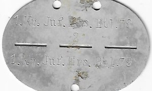 Erkennungsmarke „Hundemarke“ des „1.Kampf-Infanterie-Ersatz-Bataillon 1.79 2“. Aufgrund der beiliegenden weiteren Fundstücke müsste der Träger dieser Marke mit seiner Truppe u.a. in der Sowjetunion einmarschiert sein.
