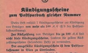 Heft mit 7 Kündigungsscheinen der Deutschen Reichspost – Wien, augegeben um 1940. Es wird hier nur ein Kündigungsschein abgebildet, da alle identisch sind.