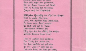 Festlied für Wilhelm Haensch von den Mitarbeitern der Firma Schmidt & Haensch. Es handelt sich vermutlich um die 1864 gegründete Firma Schmidt & Haensch aus Berlin, die bis heute u.a. Laborartikel aller Art entwickelt.