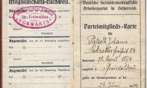 Mitgliedsbuch der „Deutschen Sozialdemokratischen Arbeiterpartei in Österreich“, ausgestellt für Johann Patzelt aus dem Landkreis Freiwaldau. Heute ist Freiwaldau ein Teil der Tschechischen Republick.