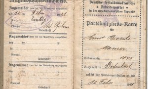 Mitgliedsbuch der „Deutschen sozialdemokratischen Arbeiterpartei in der tschechoslowakischen Republick“ aus den Jahren 1921/22. Das Buch wurde in Bodenbach ausgestellt. Bodenbach (Podmokly) ist heute der größte linkselbische Stadtteil von Děčín. Im Buch befinden sich auch mehrere Stempel und Marken der Kommunistischen Partei. d