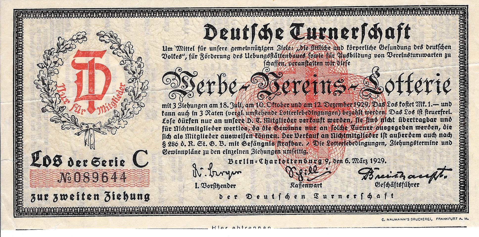 Lotterielos der „Deutschen Turnerschaft“, ausgegeben 1929 in Berlin. Die 2 Millionen Lose wurden nur an Vereinsmitglieder ausgegeben.