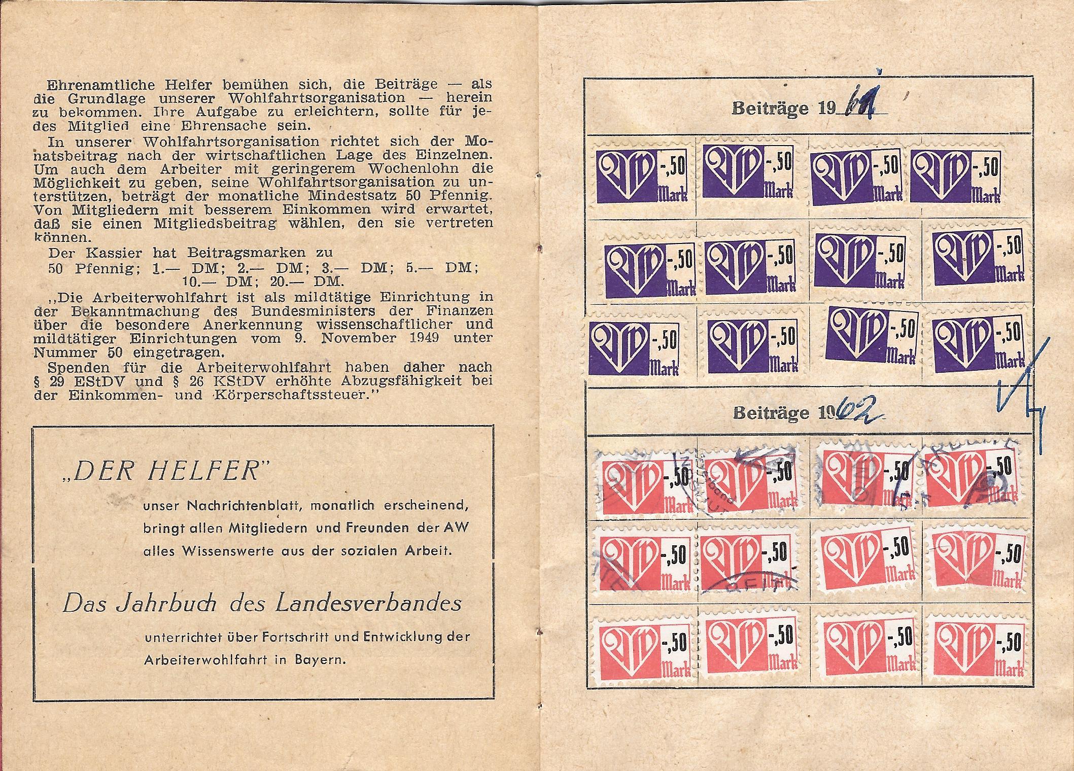 Mitgliedsbuch der Arbeiterwohlfahrt (AWO) von Margarete Czeika aus Landshut für die Jahre 1961 bis 1972.