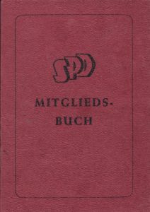 SPD-Mitgliedsbuch aus dem Ortsverein Uhingen (Baden-Württemberg) von Emil Dolensky für die Jahte 1951 bis 1963. Abgebildet nur die beschriebenen Seiten bzw. die Seiten mit Marken.