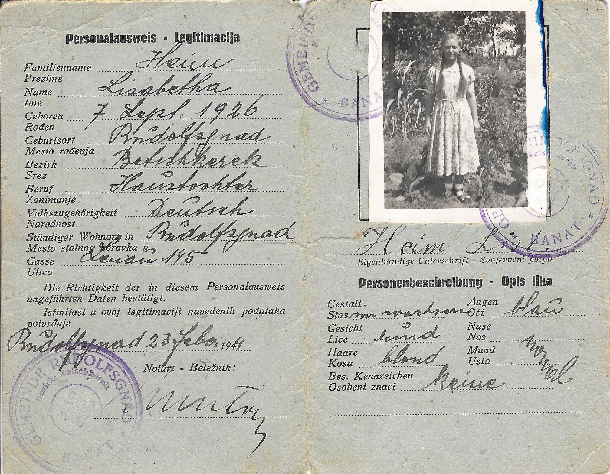 Personalausweis für die am 07. September 1926 in Rudolfsgnad/Banat geborene Lisabetha Heim. Dieses Dokument ist zweisprachig (deutsch/serbisch). Weiterhin ist noch ein Stempel aus Schärding (Österreich) mit einem handschriftlichem Vermerk vom 09. Oktober 1945 zu finden.