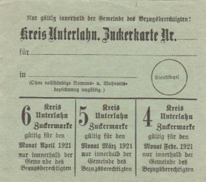 Reichsfleichkarten für den Kreis Unterlahn (Rheinland-Pfalz). gültig vom 23. Dezember 1918 bis 19. Januar 1919 (für ein Kind), 20 Januar bis 16. Februar 1919 , 07. Juni bis 04. Juli bzw. 5.Juli bis 31.Juli 1920 (für einen Erwachsenen).