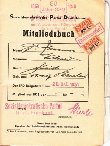 Spd-Mitgliedsbuch aus Frankfurt/Main für die Jahre 1951 – 1964. Das Buch wurde mit einer Faksimile-Unterschrift von Georg Stierkle unterzeichnet.