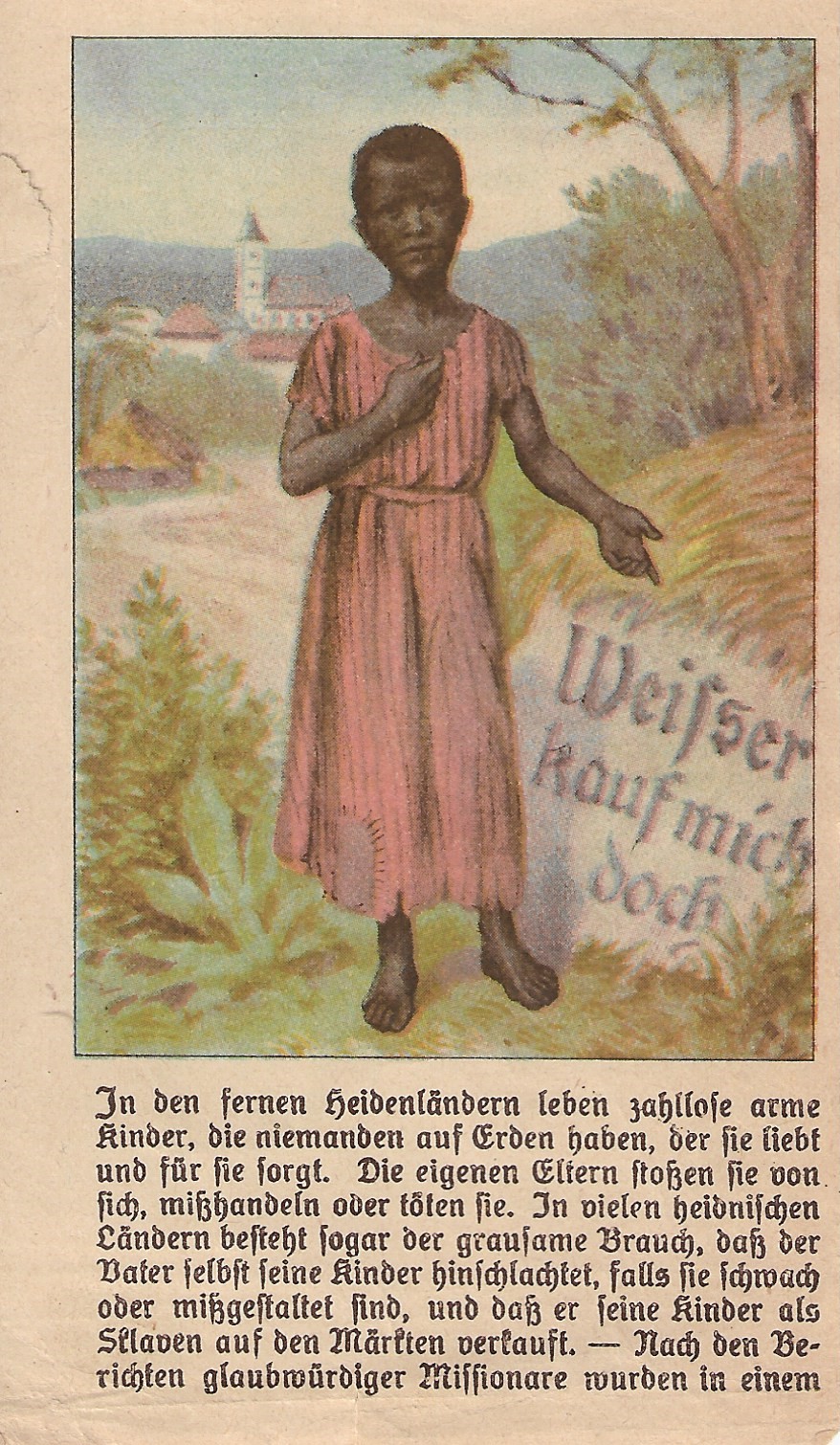 Aus den Anfängen des Kindermissionswerkes. Das Werk der heiligen Kindheit wurde 1846 von Auguste von Sartorius in Aachen gegründet. Dieses kleine Flugblatt dürfte um 1910 augegeben worden sein.